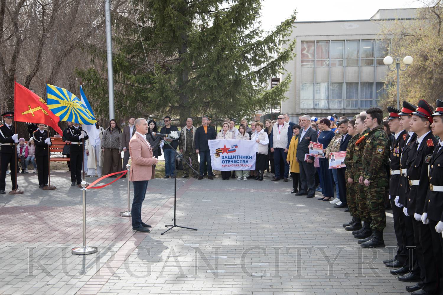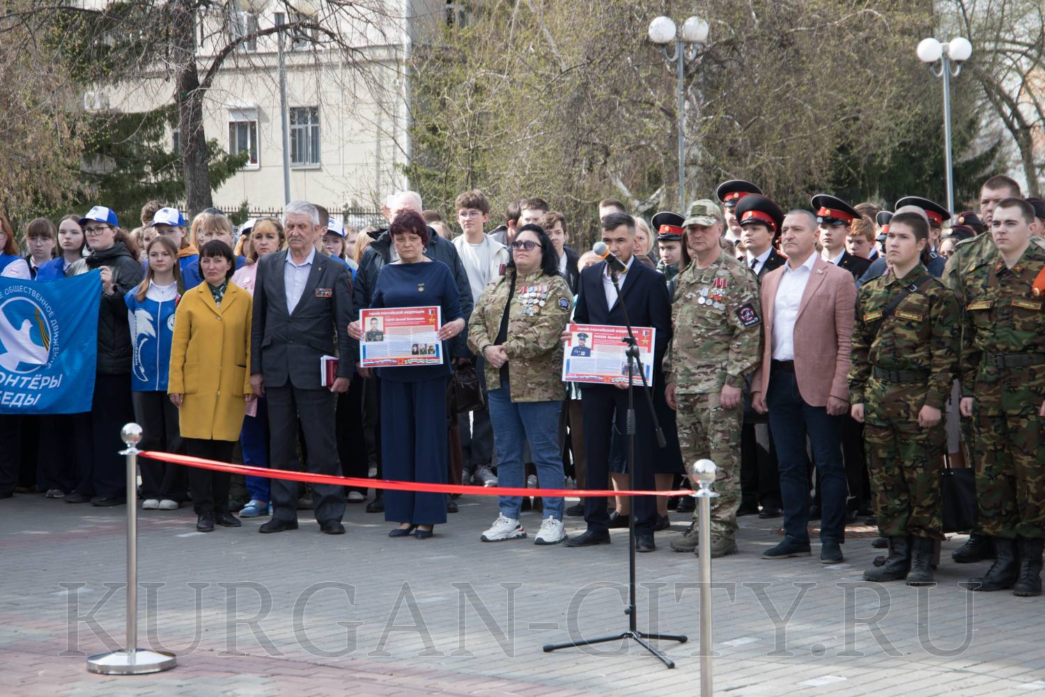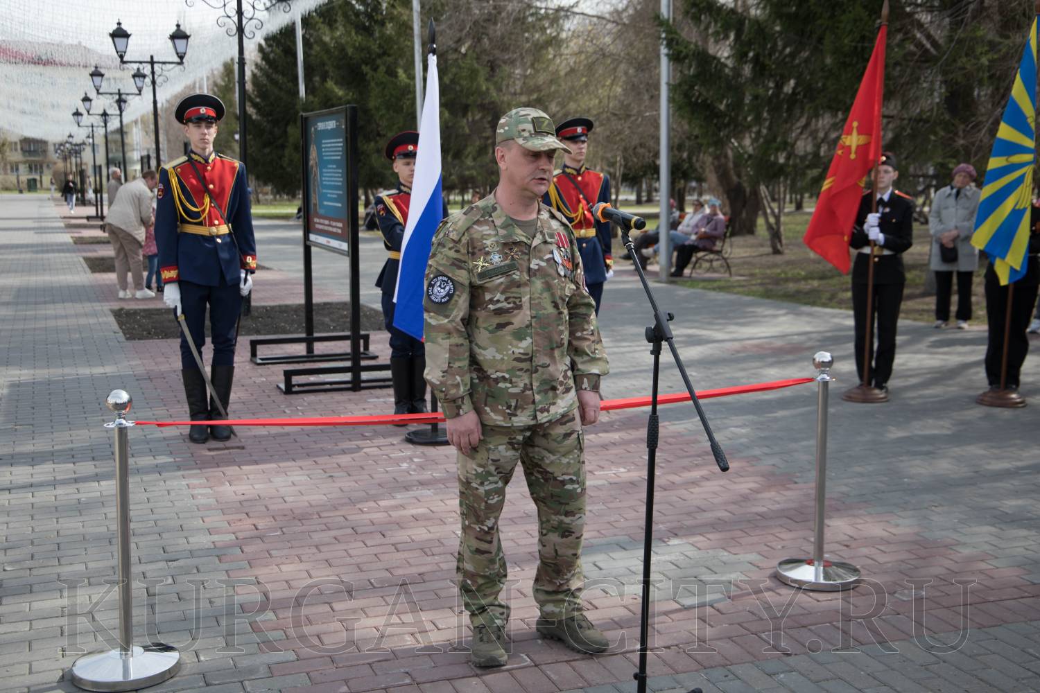 В Городском саду Кургана сегодня состоялось торжественное открытие выставки «Герои и подвиги» в рамках историко-просветительского проекта, который реализуется Российским военно-историческим обществом с 2022 года. Проект посвящен участникам специальной военной операции – современным защитникам Отечества, которые продолжают славные традиции героев Великой Отечественной войны. На мероприятие собрались ветераны специальной военной операции, родители и родные Героев СВО, кадеты и школьники, студенты, представители регионального общественного движения «Волонтеры Победы».