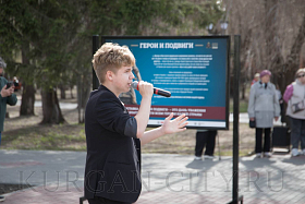 Экспозиция «Герои и подвиги» разместилась на 20 стендах и посвящена современным героям, таким, как пехотинцы Александр Матросов и Юрий Смирнов, летчики Николай Гастелло и Виктор Талалихин, политрук Клочков и снайпер Зайцев, разведчик Николай Анфиногенов и собровец Евгений Родькин. Экспозиция отражает истории жизни и подвига участников специальной военной операции, в числе которых жители города Кургана и Курганской области. Среди них уроженец села Актабан Петуховского округа Жумабай Раизов, ставший первым Героем Российской Федерации из Зауралья в период СВО.